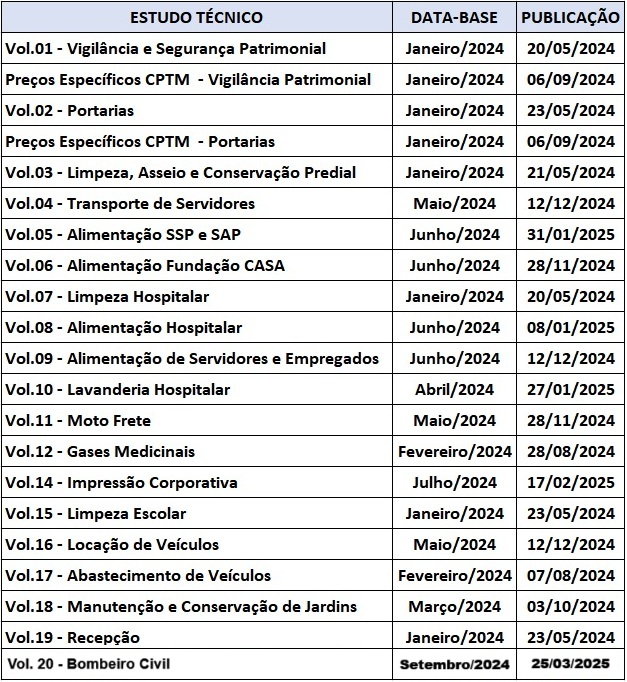 Os Estudos Técnicos de Serviços Terceirizados – CADTERC objetivam divulgar as diretrizes para contratações de fornecedores de serviços terceirizados pelos órgãos da Administração Pública Estadual, com padronização de especificações técnicas e preços referenciais. Ferramenta de fundamental importância para balizar o administrador público no momento da decisão pela terceirização de determinado serviço pelo Estado.