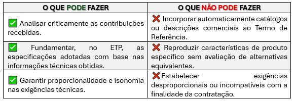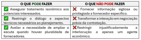 - Sempre que a natureza ou a complexidade do objeto, bem como a diversidade de soluções existentes no mercado, indicarem a conveniência de ampliar a competitividade e a pluralidade de contribuições técnicas, poderão ser utilizados instrumentos mais estruturados de interação, tais como consultas, audiências ou chamamentos públicos, nos termos da legislação aplicável.