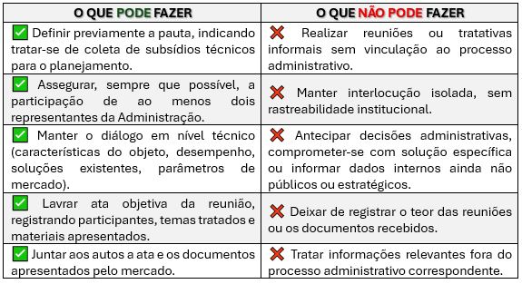 - A realização de reuniões técnicas com fornecedores ou entidades representativas é legítima, desde que observadas as cautelas previstas no parágrafo único do artigo 9º, consistentes em: