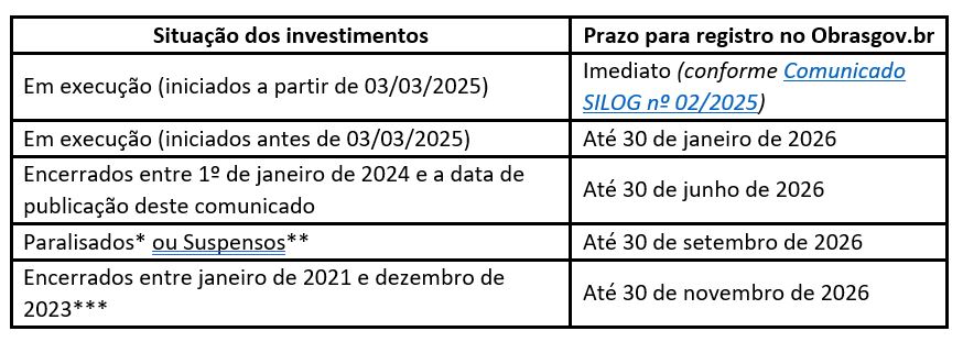 A Subsecretaria de Gestão da Secretaria de Gestão e Governo Digital (SEGES/SGGD), na qualidade de órgão central do Sistema Integrado de Logística Pública (SILOG), comunica aos órgãos e entidades da Administração Pública do Estado de São Paulo que as obras em execução, paralisadas, suspensas ou encerradas a partir de 1º de janeiro de 2023 deverão, por força do § 2º do artigo 1º da Resolução SGGD nº 53, de 27 de novembro de 2025, ser registradas na plataforma Obrasgov.br, nos prazos estabelecidos no Anexo da referida Resolução, abaixo reproduzido: