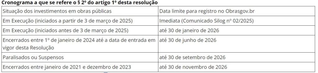 §2º – As obras em execução, paralisadas, suspensas ou encerradas a partir de 1º de janeiro de 2023 deverão ser registradas na plataforma, conforme cronograma constante do Anexo desta resolução.