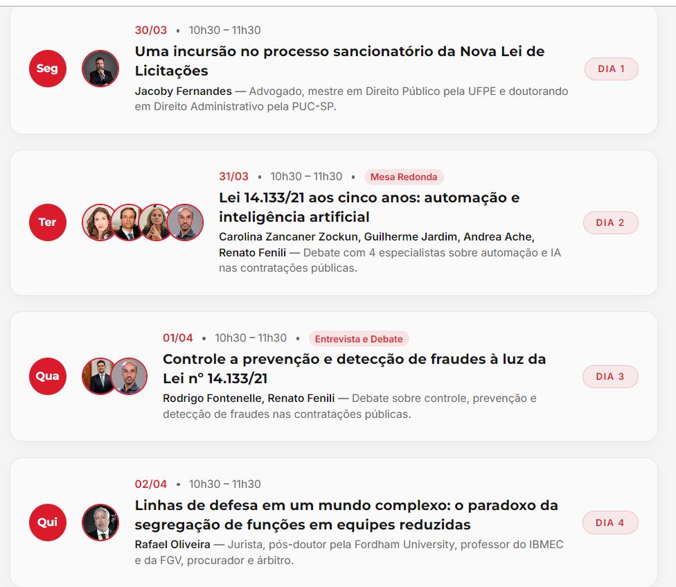 Dia 1 – (30/03) Webinar – Uma incursão no processo sancionatório da Nova Lei de Licitações – linkdo Youtube